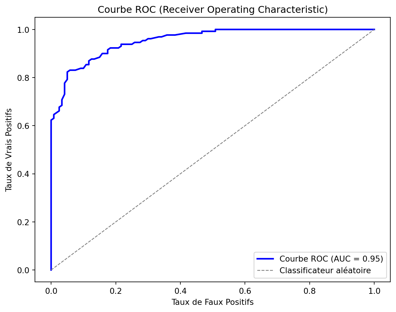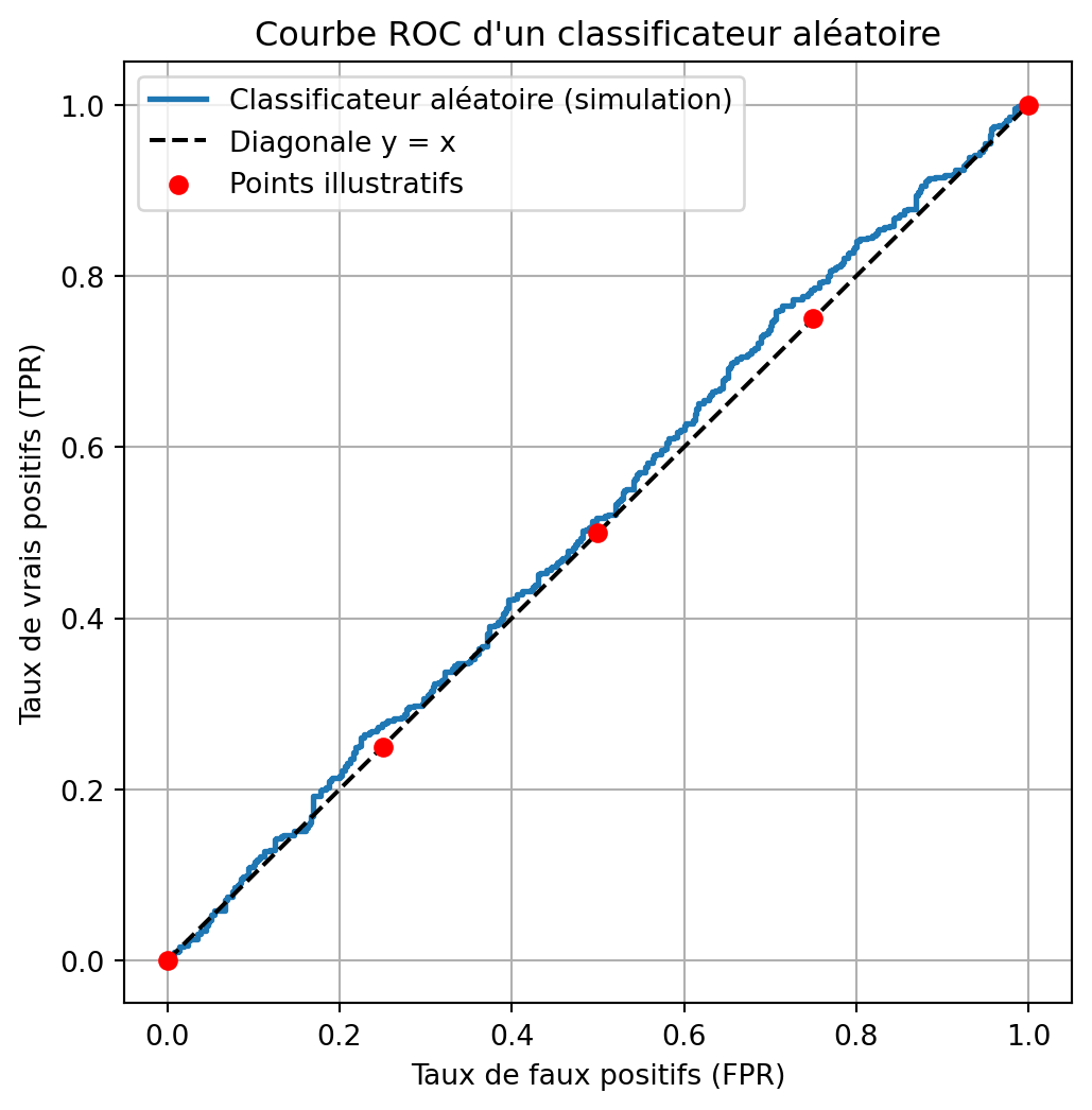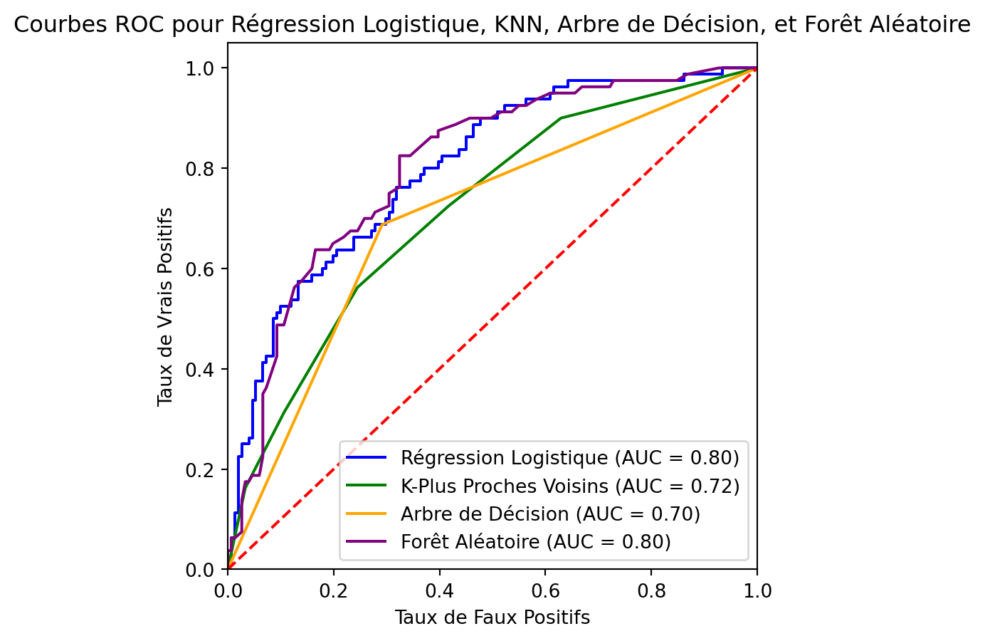 plt.plot([0, 1], [0, 1], color='red', linestyle='--') # Ligne diagonale pour le hasard