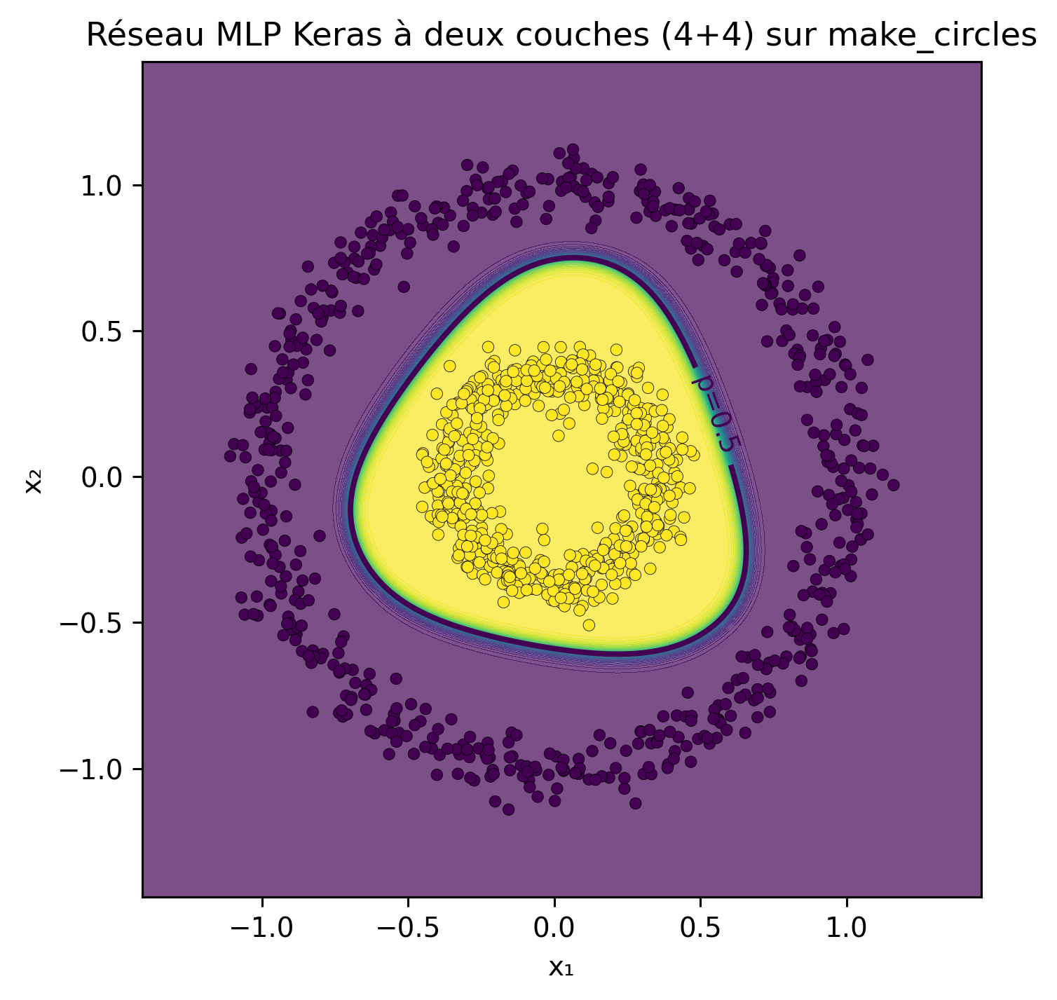 from sklearn.model_selection import train_test_split# Réseau MLP Keras à deux couches (4 + 4) sur make_circles + tracé de la frontière de décisionimport tensorflow as tffrom tensorflow import kerasfrom tensorflow.keras import layers# 0) Reproductibiliténp.random.seed(42)tf.random.set_seed(42)# 1) DonnéesX_train, X_valid, y_train, y_valid = train_test_split( X, y, test_size=0.25, random_state=42, stratify=y)