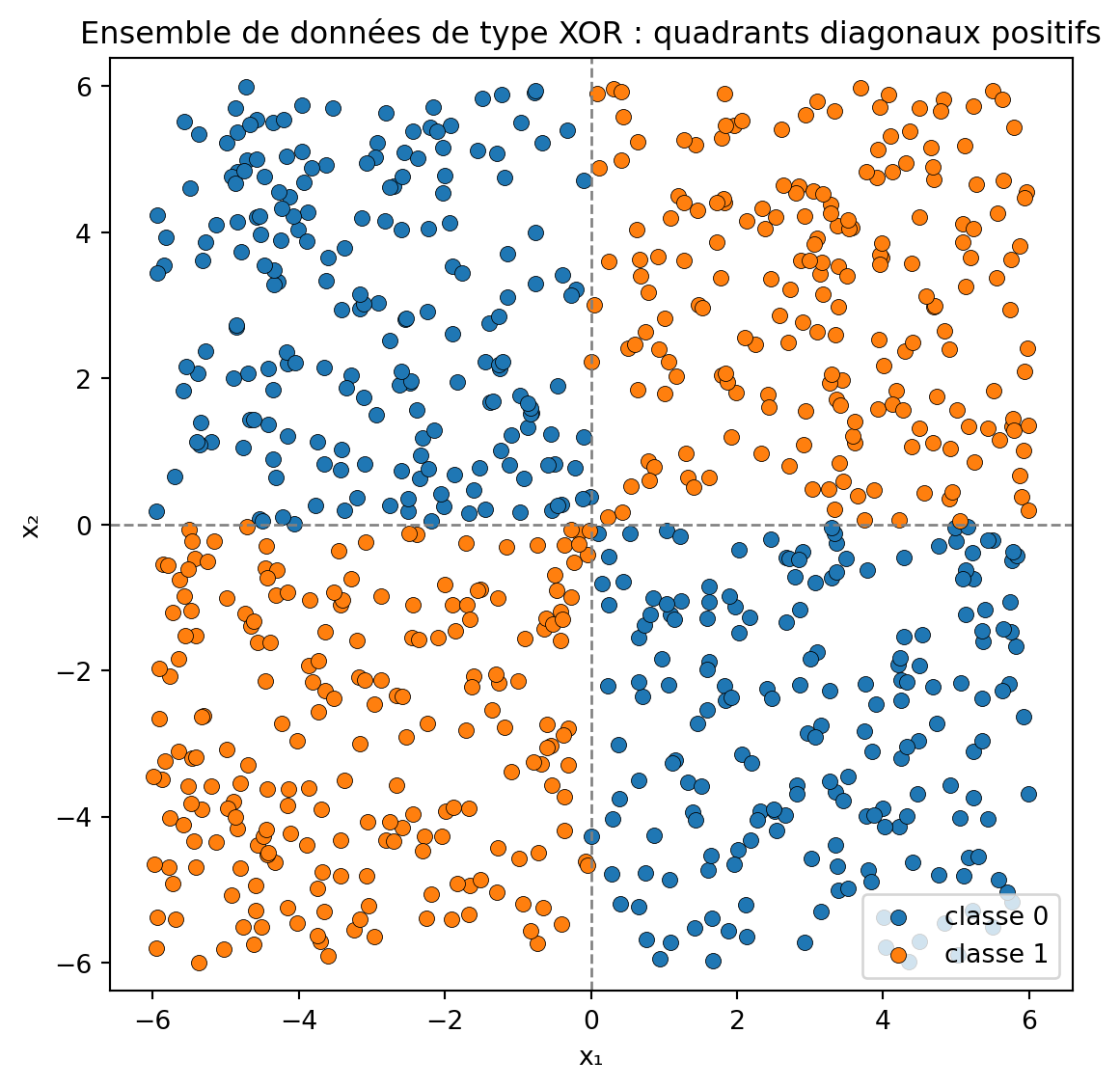 # 1. Générer l'ensemble de données XORn_samples =800rng = np.random.default_rng(42)# Attributs échantillonnés uniformément dans [-6, 6]X = rng.uniform(-6, 6, size=(n_samples, 2))x1, x2 = X[:, 0], X[:, 1]# Étiquettes : positives si (x1 et x2) ont le même signe (en haut à gauche ou en bas à droite)y = ((x1 * x2) >0).astype(int)# 2. Visualiser les donnéesplt.figure(figsize=(6, 6))plt.scatter(X[y ==0, 0], X[y ==0, 1], color="C0", label="classe 0", edgecolor="k", linewidth=0.3)plt.scatter(X[y ==1, 0], X[y ==1, 1], color="C1", label="classe 1", edgecolor="k", linewidth=0.3)# Dessiner les axes pour plus de clartéplt.axhline(0, color="gray", linestyle="--", linewidth=1)plt.axvline(0, color="gray", linestyle="--", linewidth=1)plt.xlabel("x₁")plt.ylabel("x₂")plt.title("Ensemble de données de type XOR : quadrants diagonaux positifs")plt.xlim(-6, 6)plt.ylim(-6, 6)plt.axis("equal")plt.legend()plt.tight_layout()plt.show()