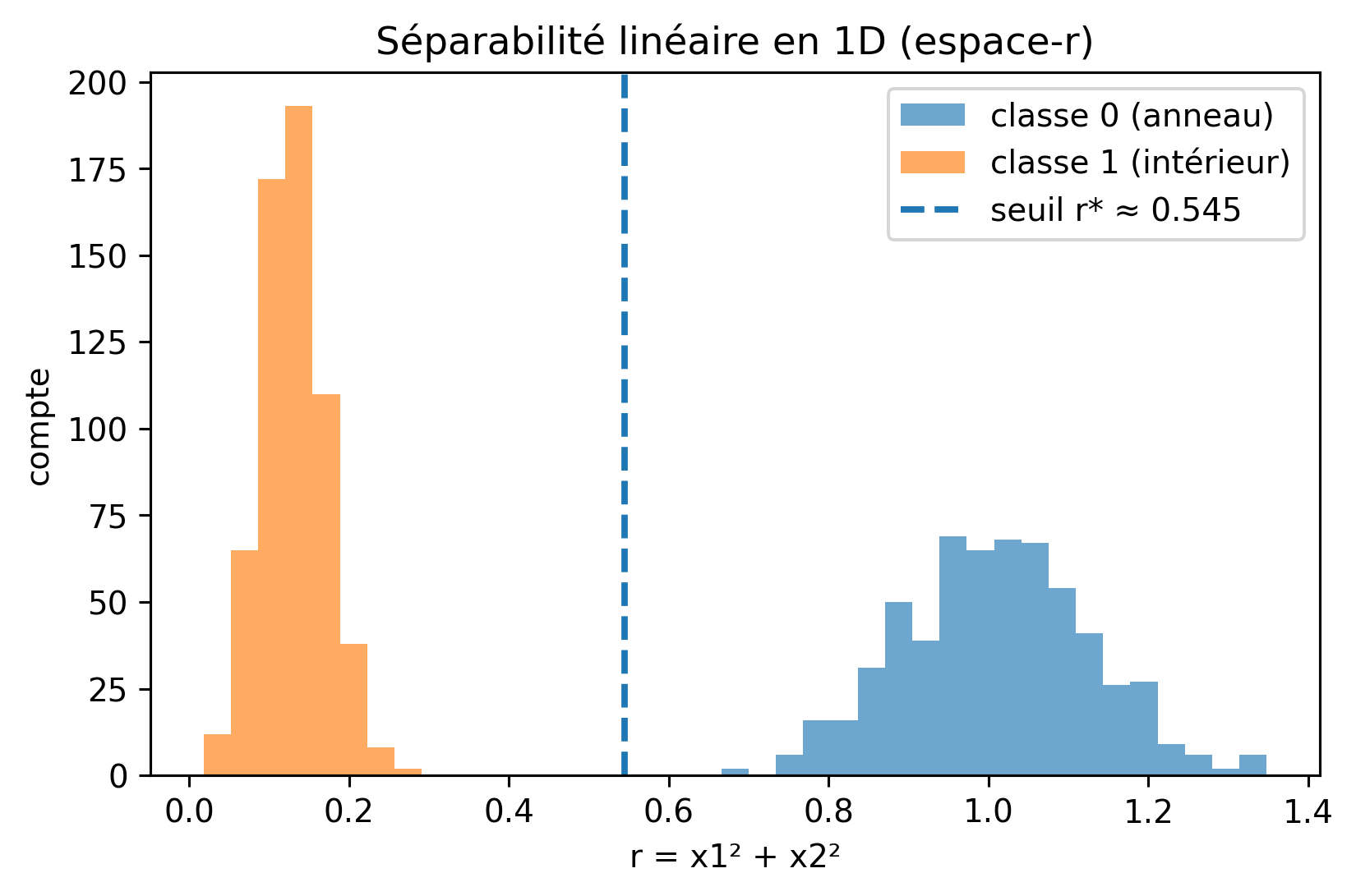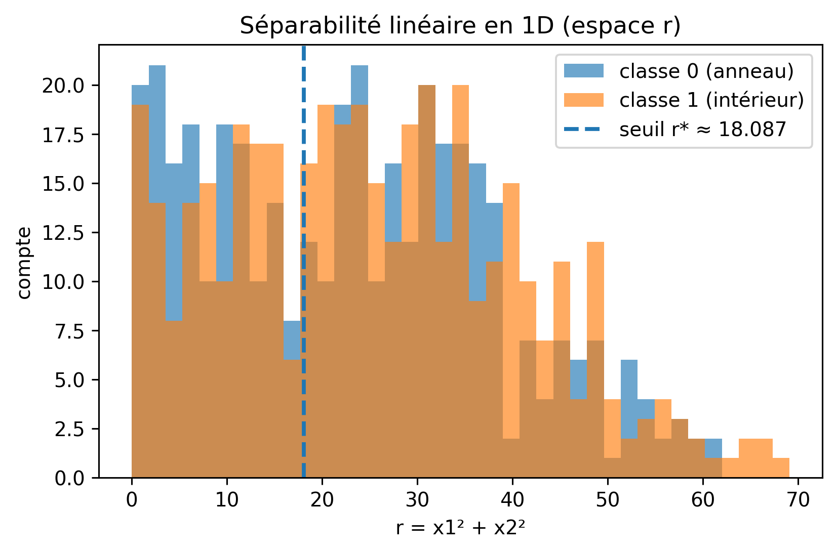 Donc, \(r\) est un attribut encodant la distance radiale, permettant à un modèle linéaire comme la régression logistique de séparer les classes avec un seul seuil en 1-D.