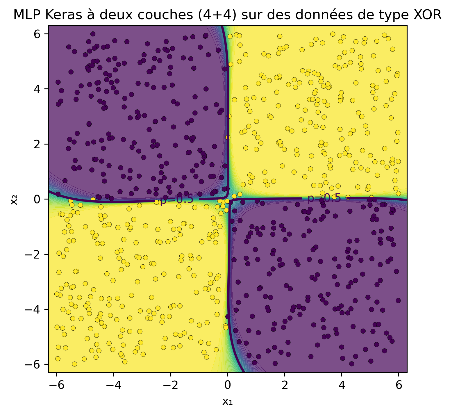 # 3) Outil de tracé : frontière de décision dans le plan original (x1, x2)def plot_decision_boundary(model, X, y, title="Frontière de décision du MLP Keras"):# grille sur le plan d'entrée pad =0.3 x1_min, x1_max = X[:,0].min()-pad, X[:,0].max()+pad x2_min, x2_max = X[:,1].min()-pad, X[:,1].max()+pad xx, yy = np.meshgrid( np.linspace(x1_min, x1_max, 400), np.linspace(x2_min, x2_max, 400) ) grid = np.c_[xx.ravel(), yy.ravel()]# prédire les probabilités sur la grille p = model.predict(grid, verbose=0).reshape(xx.shape)# probabilités remplies + contour p=0.5 + points de données plt.figure(figsize=(5.2, 5.2), dpi=140) plt.contourf(xx, yy, p, levels=50, alpha=0.7) cs = plt.contour(xx, yy, p, levels=[0.5], linewidths=2) plt.scatter(X[:,0], X[:,1], c=y, s=18, edgecolor="k", linewidth=0.2) plt.clabel(cs, fmt={0.5: "p=0.5"}) plt.title(title) plt.xlabel("x₁") plt.ylabel("x₂") plt.tight_layout() plt.show()plot_decision_boundary(model, X, y, title="MLP Keras à deux couches (4+4) sur des données de type XOR")