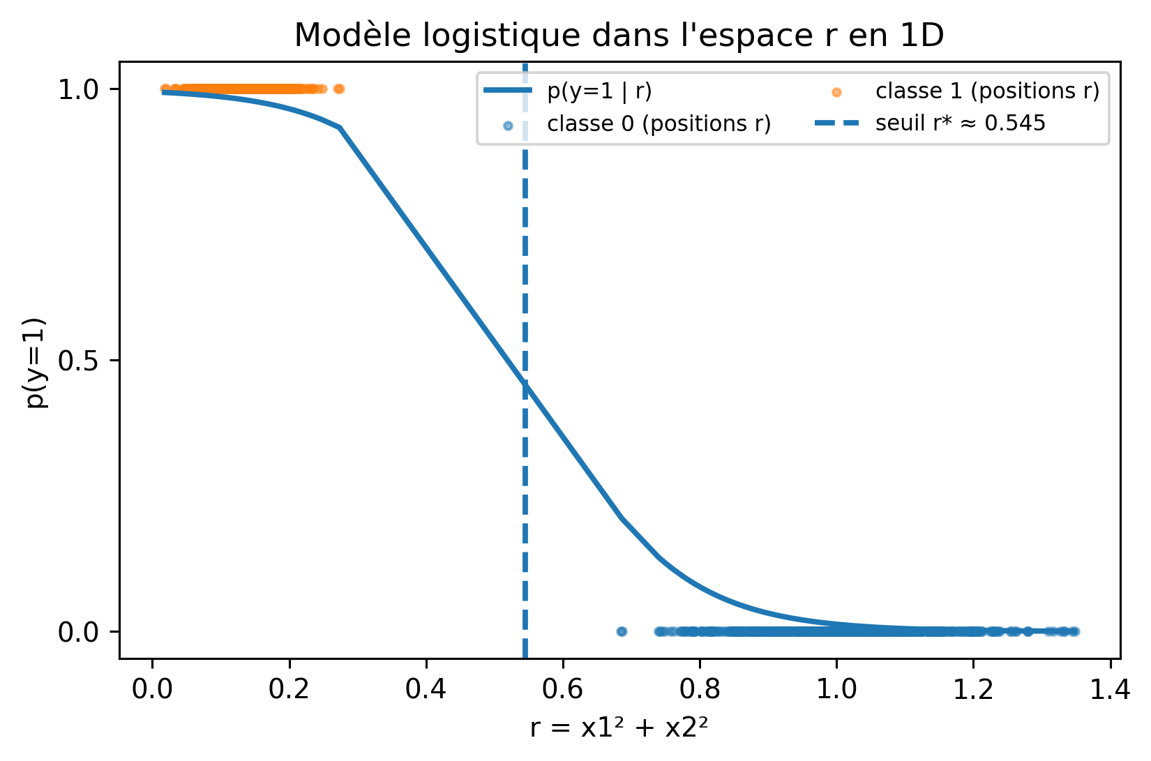r = (x1**2+ x2**2).reshape(-1, 1)# Modèlesclf_r = LogisticRegression().fit(r, y)quad = Pipeline([ ("poly", PolynomialFeatures(degree=2, include_bias=False)), ("logreg", LogisticRegression(max_iter=1000))]).fit(X, y)# Seuil r* (p=0.5) pour le modèle basé uniquement sur rw =float(clf_r.coef_[0][0]); b =float(clf_r.intercept_[0])r_thresh =-b / w ifabs(w) >1e-12elseNone