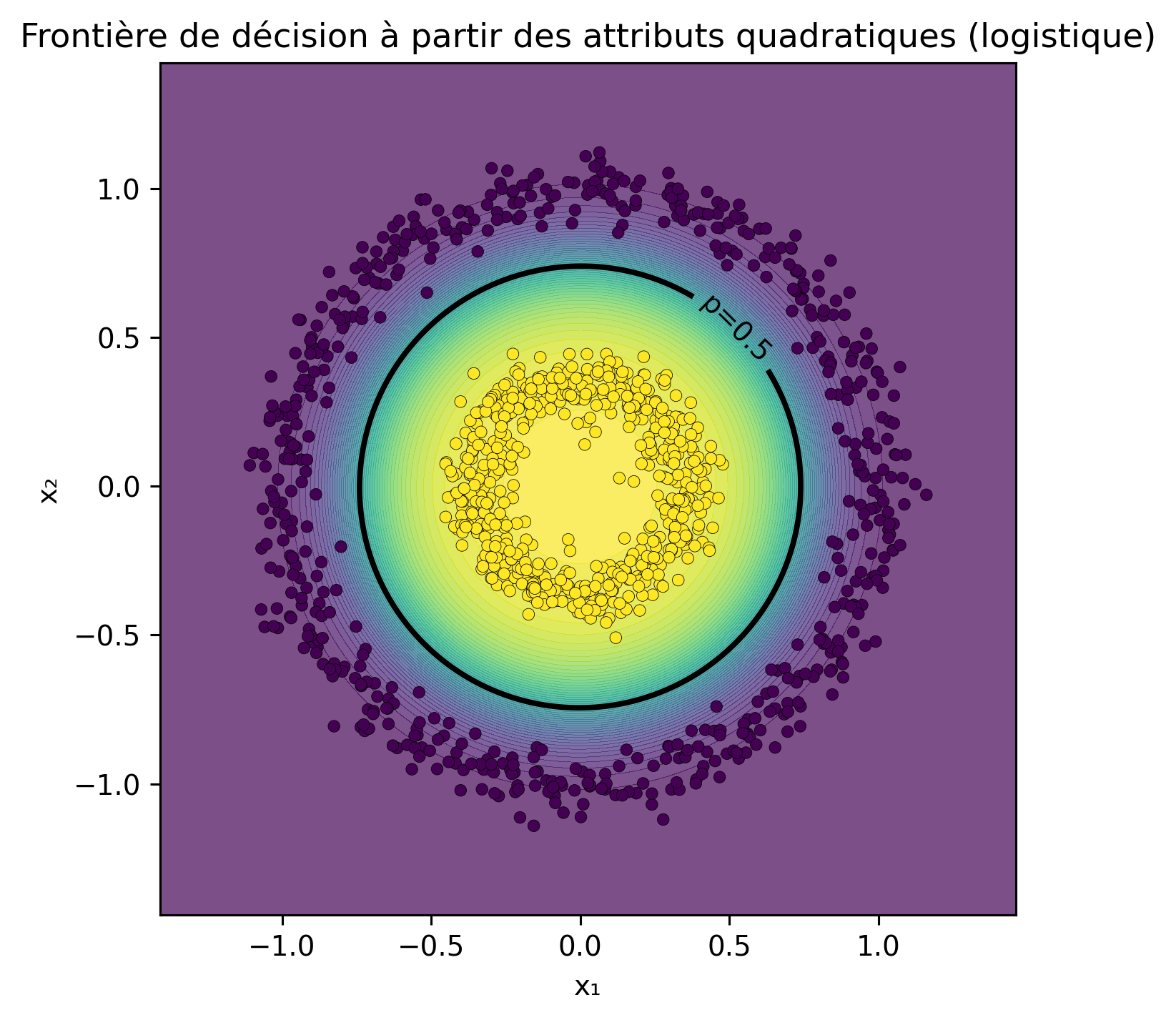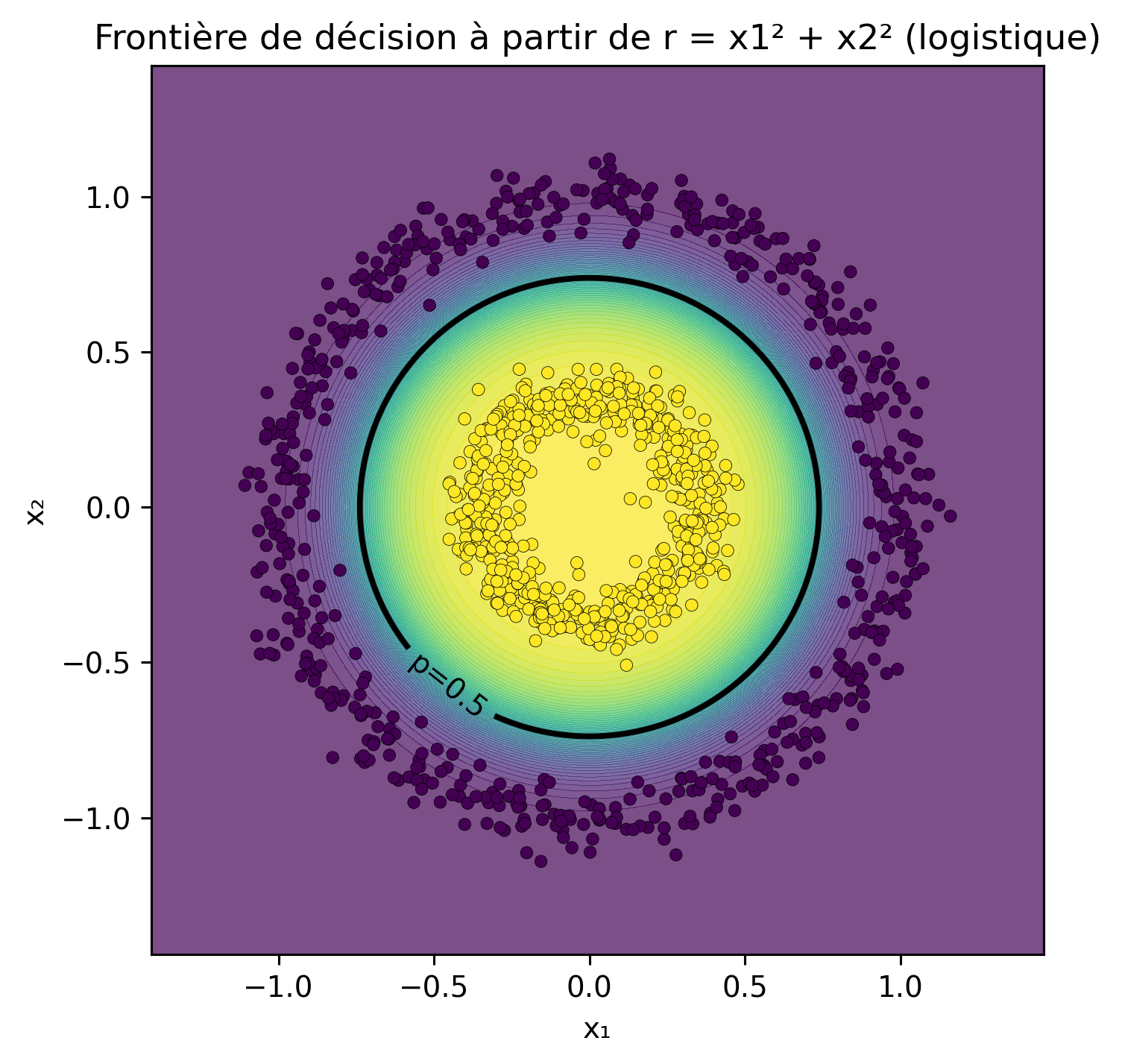 from sklearn.pipeline import Pipelinefrom sklearn.preprocessing import PolynomialFeaturesr = (x1**2+ x2**2).reshape(-1, 1)# Modèlesclf_r = LogisticRegression().fit(r, y)quad = Pipeline([ ("poly", PolynomialFeatures(degree=2, include_bias=False)), ("logreg", LogisticRegression(max_iter=1000))]).fit(X, y)# Seuil r* (p=0.5) pour le modèle uniquement basé sur rw =float(clf_r.coef_[0][0]); b =float(clf_r.intercept_[0])r_thresh =-b / w ifabs(w) >1e-12elseNone